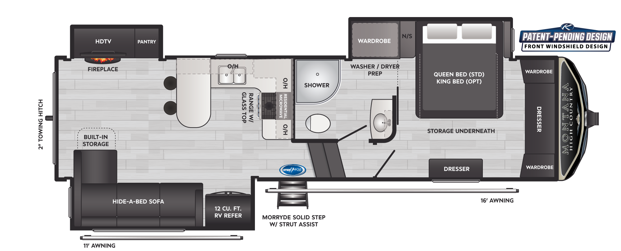 Presenting you next is one of the highly recommended small fifth wheel from Montana. Made from heavy-duty aluminum, the trailer's frames exhibit a glossy finish to offer an appealing look. There is a large bedroom that can easily accommodate a king-sized bed.